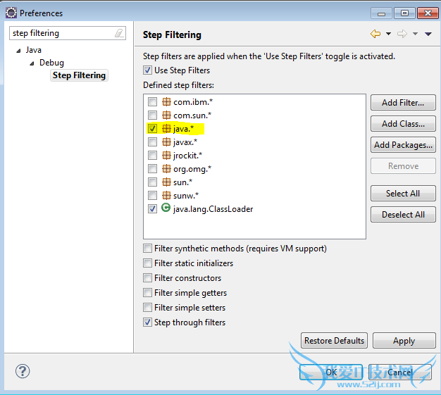 当我们进入(F5)方法的时候,我们还可以访问其外部库(比如java.*),我们可能不需要这个库,就可以在Perference选项卡页面添加一个过滤器来排除这个包。