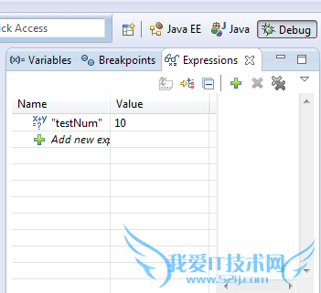 按Ctrl+Shift+D或者Ctrl+Shift+I来显示选定变量或者表达式的值。我们也可以给一个变量或表达式添加永久观察点,当程序在调试时,这些观察点就会在表达式视图(Expression view)中显示出来。