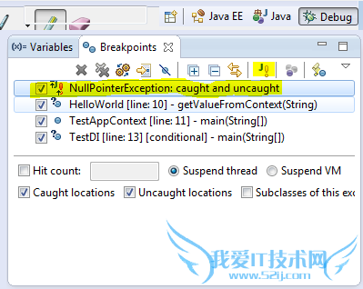 在断点视图中,有一个J!标记按钮!我们可以使用该按钮来添加一个Java异常断点。例如,我们想让程序在遇到空指针异常(NullPointerException)时,仍然能继续调试,那么我们可以使用该按钮来添加一个异常断点!