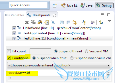 如果你不知道如何添加断点,只需点击左边面板(行号前面)断点即被创建。在调试界面中,“断点”视图会把所有被创建的断点列出来。我们可以给它加一个布尔条件,也就是说,该断点会被激活并且如果布尔条件为真,就会执行该断点,否则将会跳过往下执行。