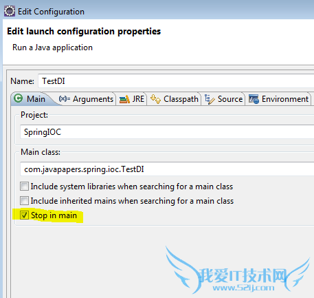 在运行/调试设置中,编辑配置对话框中有“Main”这个选项卡,我们可以勾选“Stop in main”这个复选框。如果选中,那么在调试一个基于main方法的Java程序时,程序会在main方法第一行位置便停止执行。
