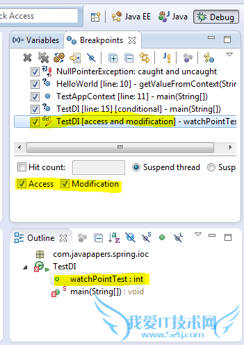 这是一个非常好的功能,当选定的属性访问或修改程序时,程序会停止执行并允许进行调试。在Outline视图中选择一个类变量并从上下文菜单中选择切换监视点,属性监视点将会被创建,在断点(Breakpoints)视图中会把所有监视点用列表的形式显示出来。