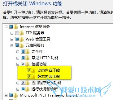 可喜的是要做到这两点,在IIS7里非常简单,首先说压缩,在win7里利用“打开或关闭windows功能”里打开IIS性能工具里的“动态内容压缩”和“静态内容压缩”,如图1。