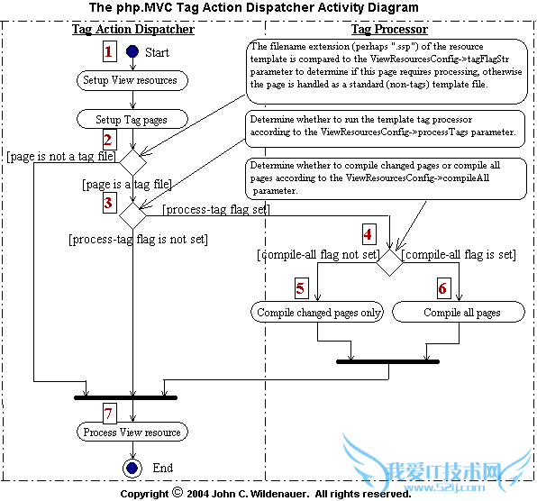 下面的图表显示了PHP.MVC模板标签系统的总揽.左边展示的是模板标签系统的程序流程.右边是TagActionDispatcher的程序流程,还有标签模板是怎样使这些类进行交互.
