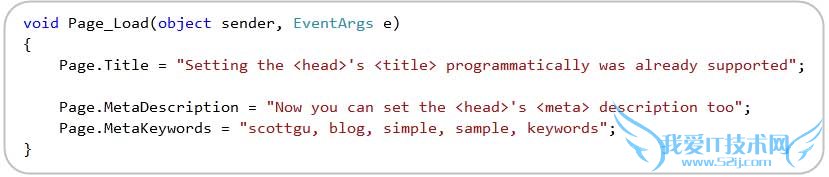 ASP.NET 4 Web Forms中一个很好的改进是在Page类中加了2个新属性:MetaKeywords 和 MetaDescription,它们使得在后台代码类中用编程的手法设置这些值更容易,也更干净。