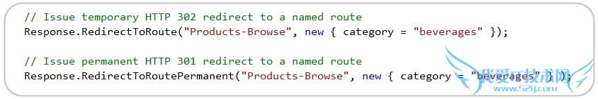 ASP.NET 4还引进了新的Response.RedirectToRoute(string routeName) 和 Response.RedirectToRoutePermanent(string routeName)辅助方法,可以用来通过URL导向引擎做临时或永久性的重新定向。下面的代码片段示范了如何发出临时和永久性的重新定向到注册在URL导向系统中的具名路径的(该路径接受一个category参数)。