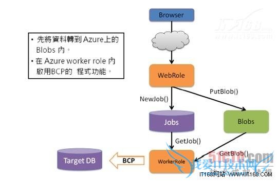 如图1所示,基于这个原理运用Web Role作为用户的接口负责读取上传的数据,并将数据放入Blobs中,然后产生Jobs的工作项。至于Worker Role的部分则一直负责观察Jobs的工作项目,一旦有工作项目进入到Blobs中,就会把数据读出来,再运用BCP的工具程序一次性写入到目标数据库中,完成一个Jobs的工作。