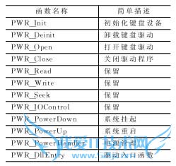 矩阵键盘作为一种输入设备与其他外围设备有很大的区别,应用层不能对其发布命令来操作它。因此一般流驱动接口函数中对设备进行操作的接口函数在矩阵键盘驱动中只是作了保留,并未有实质性的功能。接口函数中比较重要的是PWR_Init和PWR_DllEntry。下面简单介绍这两个函数: