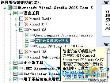 现在就来介绍开发SQL Server 2005 Compact Edition移动设备端应用应具备的基本条件吧!通常我们都是使用Visual Studio 2005 Professional及更高的版本进行智能设备程序的开发(Visual Studio 2005 Express目前并不支持)。在安装Visual Studio 2005的过程中,只需要将图1中的“智能设备可编程技术”单选框选中,安装完毕后就可以利用Visual C#开发托管代码的智能设备程序了。