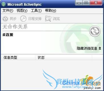 当ActiveSync安装完毕后,会提示你重新启动计算机才能完成相应的设置。ActiveSync的界面如图2所示: