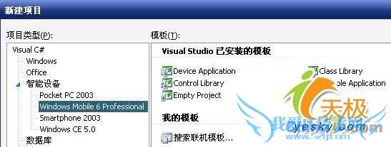 当Windows Mobile 6.0 SDK安装完毕后,我们就可以通过Visual Studio 2005来开发针对Windows Mobile 6.0的智能设备程序了。如图5所示,在“智能设备”栏中我们会发现多了“Windows Mobile 6 Professional“这一项,而且通过右侧的模板,我们可以创建五种不同类型的项目。
