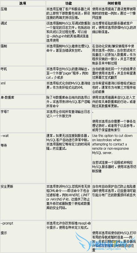 表A是其中一些不太知名的MySQL客户程序启动选项。表格中的每一条目解释了每个选项的功能以及用法。这将给予你MySQL应用范围和深度等问题一些想法,帮助你完成日常应用程序开发。