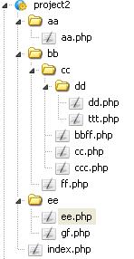 看我们的实验图,在图中项目下分别有aa bb ee 三个同级目录和一个index.php文件,在bb下又有cc目录,cc下又有dd目录和cc.php ccc.php两个文件,同样dd下也包含一个dd.php文件。凡是上层对下层均属上级引用.