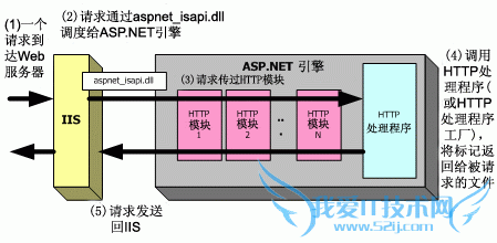 在Asp.Net时代,IIS 接收到请求并将其调度给 aspnet_isapi.dll之后,ASP.NET 引擎开始逐个对已配置的HTTP模块(HttpModules)进行初始化,然后再调用正确的HTTP处理程序并呈现被请求的资源,最后将所生成的标记返回给 IIS 和请求客户端(如下图所示)。