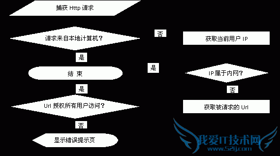 使用HttpModules实现IP过滤功能的核心思想是:自定义一个HttpModule捕获每一个用户请求,然后获取相关的用户IP和被请求的Url进行逻辑判断,将未授权的请求重定向到一个错误提示页。Http请求授权与否的判断逻辑为: