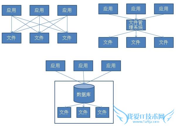 从以上看出,数据库技术是属于数据处理技术。还有类似的解决方案就是文件管理的形式。不少人有过这样的疑问文件完全也可以进行数据处理,为什么要出现数据库技术呢?文件管理中,数据文件和应用程序一一对应,会造成数据冗余,数据不一致性和数据依赖。这样给程序编写数据维护带来很多问题。后来出现过文件管理系统作为应用程序与数据文件的接口,这些应用程序只需要与文件管理系统交互就可以带来了一些灵活性。不过这种方式还是解决不数据冗余,数据库一致性、处理效率低的问题,特别是在较大规模的系统中更加明显。针对这些问题,后来人们做了很多探索解决文件管理系统分散管理的缺点,推出能对数据集中控制统一管理的技术——数据库技术。可以通过以下的图看出这里描述的三种方式的区别。