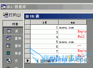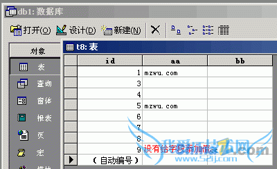 我们建一个表来测试下,表中只有两个字段id(自动编号)和aa(文本):