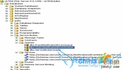 图1是SQL Server Management Studio的一个快照,它显示了在数据库的Service Broker部分中的队列(Queues)和服务(Services)。