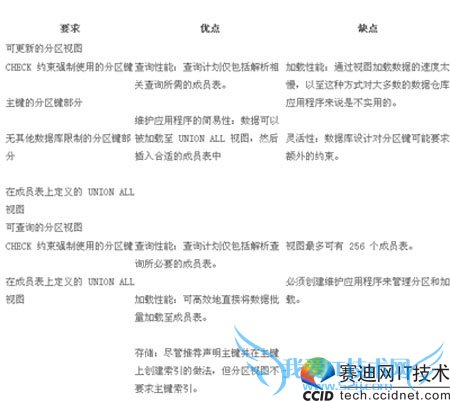 SQL Server 数据库中的分区表可以使用可更新或可查询(不可更新)的分区视图。在这两种情况下,表分区都是由每个分区都包含正确数据的 CHECK 约束来创建的。一个可更新的分区视图支持对视图进行 INSERT (或 UPDATE 或 DELETE)操作,并将操作推入至正确的基础表。这很有益处,但数据仓库应用程序通常需要进行批量加载,而这是无法通过视图执行的。下表总结了可更新和可查询分区视图的要求、优点和缺点。