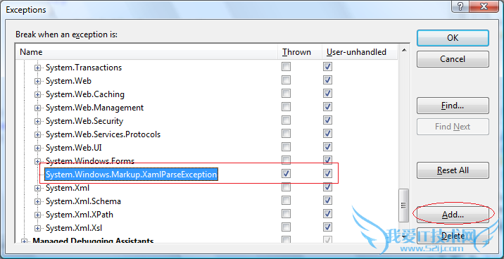 除了上面的异常捕捉机制,另一种方案是利用Visual Studio的异常对话框。在菜单调试(Debug)下的异常(Exception...)对话框中,通过右下的添加按钮把System.Markup.XamlParseException加入到异常捕捉列表中。并选中Thrown复选框。如此也能获取更多的关于XamlParseException的信息。
