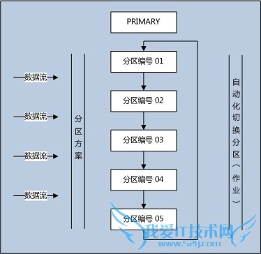 数据流经过分区方案,被分配到不同的分区中,从图中可以看出,分区是可以重复利用的,后台有一个所谓的自动化切换分区的作业在跑,目的就是如果重复利用这些分区。这里的PRIMARY目的就是说明它与其它文件组的一个平级关系,而且我们在做交换分区时候也会用到PRIMARY,需要事先分配足够的空间。