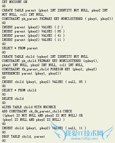 以下为引用的内容: CREATE TABLE Child (pkey1 INT IDENTITYCONSTRAINT pkChild PRIMARY KEY,Parentpkey1 INT NULLCONSTRAINT fkChildParent FOREIGN KEYREFERENCES Parent(pkey1),col1 INT NULL) GOINSERT Child (Parentpkey1, col1) VALUES (null,2)GO |