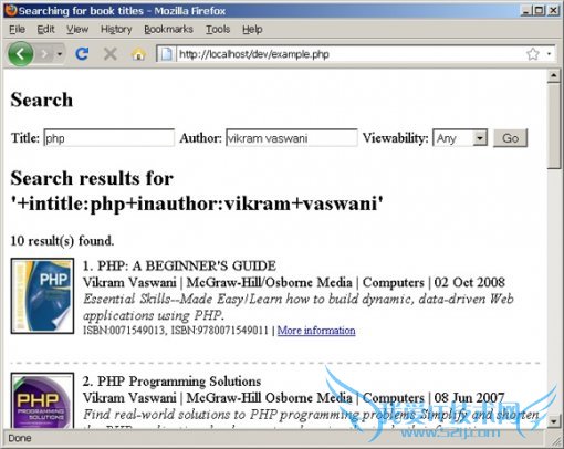 如 清单 1 所示,除图书标题之外,Google Book Search Data API 返回的卷提要包含相当多的信息:作者和出版商名称、ISBN 编号、页数、主题等。使用 Zend_Gdata_Books,所有这些信息都被表示为一组对象,您可以在一个 PHP 脚本范围内访问并操作这些对象来创建更便于提供信息的搜索结果页面。