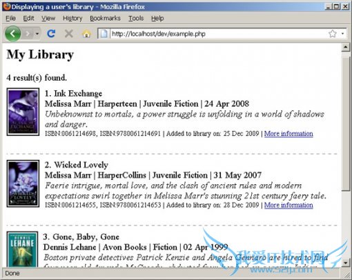 清单 6 中的大部分内容已在本文前面的小节中出现过。这个脚本打开一个到 Google Book Search 服务的验证连接,初始化 Zend_Gdata_Books 对象,然后使用 getUserLibraryFeed() 方法来检索提要,该提要包含用户图书馆中的图书列表。该提要以 PHP 对象数组的形式表示,您现在可以轻松迭代这个数组,处理每个条目并使用适当的 HTML 标记来显示结果。