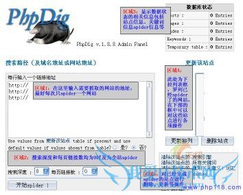 进入install.php后系统要求我们输入PHPdig管理用户名和密码,默认情况下均为admin,进入后出现如下界面(汉化后):