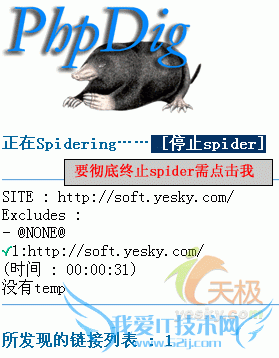 2)单击spider按钮,页面跳转到spider信息页面,程序开始自动spider站点http://soft.yesky.com的内容。