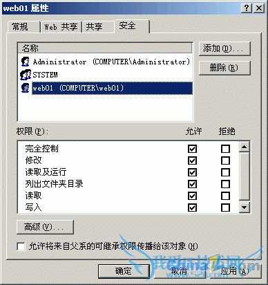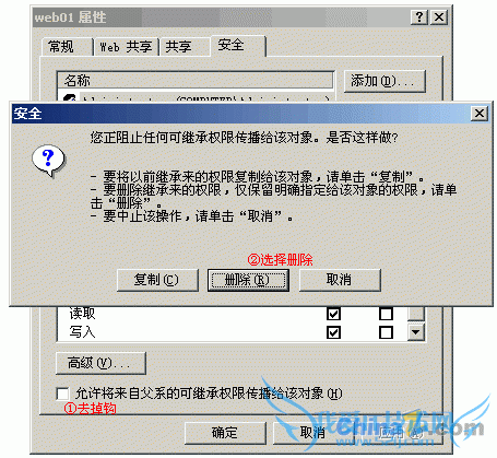 打开E:\web01文件夹属性窗口,选择安全选项卡,先去掉"允许将来自父系的可继承权限传播给该对象"前的钩,经弹出的对话框中选择删除继承权限。