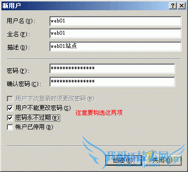 建立用户web01,注意要钩选"密码永不过期"(否则背后会出现"HTTP 401.1 - 未授权:登录失败"),并设置其只隶属于webs用户组。同样在建一个用户web02。