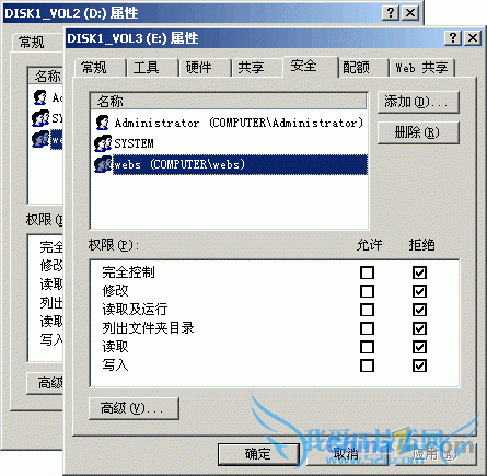 打开各分区的安全选项卡依次给各分区授于administrator和system完全控制权限,并设置webs组完全拒绝权限。