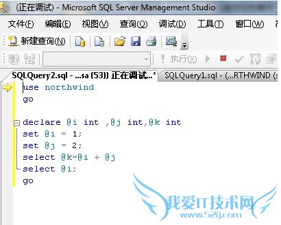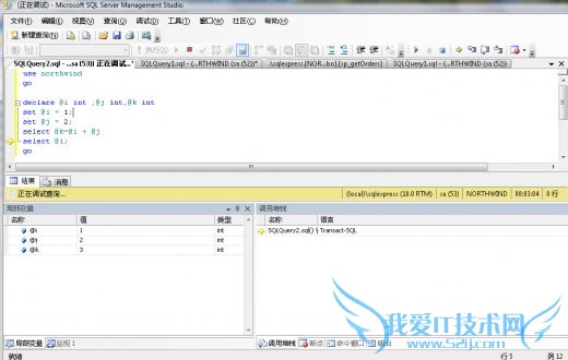 非常简单的定义了 三个int 型变量:i、j、k并且对这些变量进行简单的逻辑运算,在Management Studio 中只要轻松的按F11键,即可调试以上代码块。