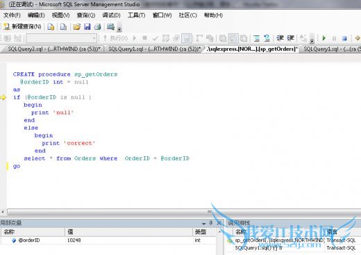 当断点经过exec sp_getOrders 10248 这段代码时,点击F11进入sp_getOrders存储过程进行逐语句debug。