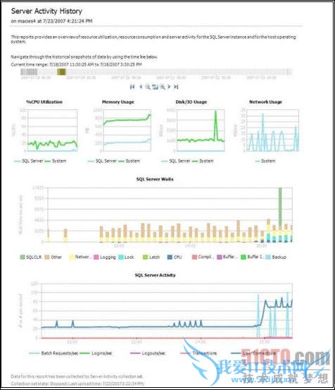 性能套件提供了一组强大的预先配置的系统收集集合,包括Server Activity、Query Statistics和Disk Usage,来帮助你快速地分析你收集的数据。你通常使用Server Activity 系统收集集合来开始监控和故障排除。在SQL Server管理套件中发布了一组与每一个系统收集集合相关的报表,你可以将这些报表作为性能状态面板来帮助你分析你的数据库系统的性能,如图1所示。