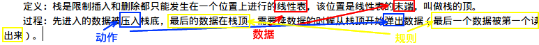 过程:先进入的数据被压入栈底,最后的数据在栈顶,需要读数据的时候从栈顶开始弹出数据(最后一个数据被第一个读出来)。