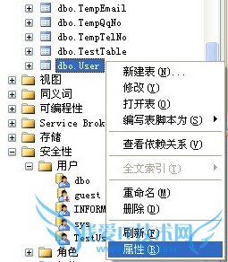 4. 现在我们就可以对TestLog数据库中的User表进行权限的设置了,【表】-【 属性】