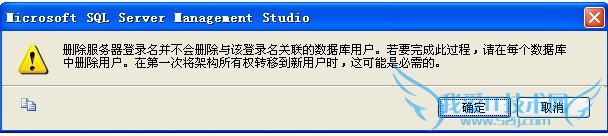 3. 其实在数据库级别的【安全性】创建的用户是属于全局的,当设置了某个数据库,比如TestLog之后,这个用户就会出现在这个数据库的【安全性】列表中。如果删除TestLog这个用户,会出现下面的提示。删除了后,这个用户就无法登陆了。需要去对应的数据库中删除用户,如果没有删除又创建,是会报错的。
