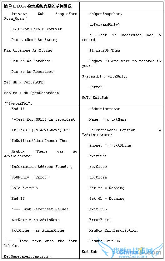 当需要在窗体上向用户显示恰当的姓名和电话号码时,可以使用OnOpen或OnLoad事件填充窗体上的相应标签,在本例中,我们把标签命名为“PhoneLabel”和“NameLabel”。清单1.10 .A显示了这个示例函数的代码。
