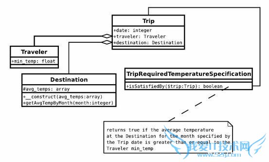 | class TripRequiredTemperatureSpecification { public function isSatisfiedBy($trip) { $trip_temp=$trip->destination->getAvgTempByMonth( date(‘m’, $trip->date)); return ($trip_temp >=$trip->traveler->min_temp); } } |