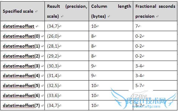 最后新的日期数据类型是DATETIMEOFFSET数据类型,此数据类型让你存储的日期和时间(24小时制)是时区一致的。时间部分能够支持如DATETIME2和TIME数据类型那样的高达100纳秒的精度。DATETIMEOFFSET需要8到10字节的磁盘空间开销,这完全取决于你定义的时间部分的精度,如下表所示: