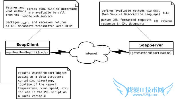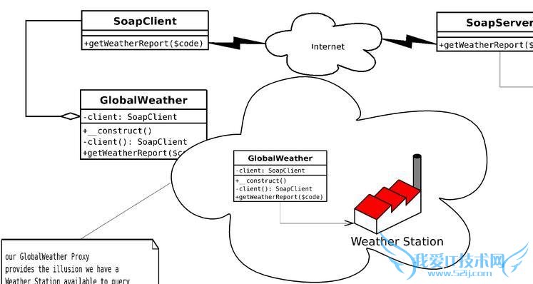 ÏÂÃæÓÐÒ»¸ö¹ØÓÚÔ¶³Ì´úÀíµÄͼ(Ö»ÓÐÒ»¸ö·½·¨)¡£ SoapClientÊDZ¾µØ¶ÔÏó(¿Í»§¶Ë)µÄý½é,ͨ¹ýµ÷ÓÃSoapServer(subject)À´»ñµÃÌìÆøÐÅÏ¢¡£È«²¿ÈÎÎñ¶¼Í¨¹ýHTTPÐÒé´ï³É,±ÈÈç´´½¨,´«Êä,½ÓÊÕ,ͨ¹ýSoapClientÀàÄÚ²¿µÄ¹¦ÄܽâÎö¸´ÔÓXMLÎĵµÍê³ÉÔ¶³ÌͨÐÅ¡£ÍøÂç·µ»ØµÄ½á¹û¸úÖ±½Óµ÷ÓÃSoapServer¶ÔÏóAPIµÄЧ¹ûÒ»ÑùµÄ,Òò´ËSoapClient¿ÉÊÓΪһ¸ö±¾µØµÄ´úÌæÕß(´úÀí),À´»ñµÃÔ¶³ÌSoapServerµÄ×ÊÔ´¡£