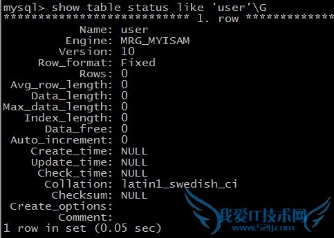查看创建后表user的信息,可见表的当前存储引擎是merge,如图所示: