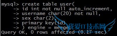 例如,假设要创建一个名为user的表,此表包括id,用户名username和性别sex三个字段,并且要设置表类型为merge。则可用如下的方式创建此数据表,