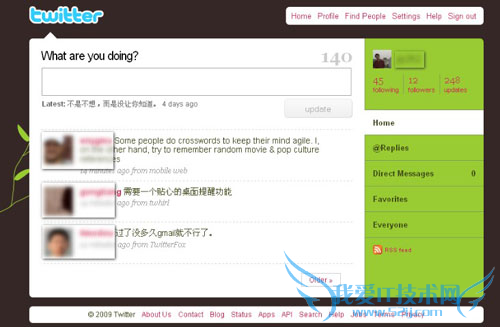 通过twitter,用户可以任何时候发布他们在做什么,twitter会及时显示这些信息。从而,每个朋友都能同时知道你在做什么。twitter主页如下: