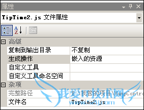 这时需要在后台注册该js文件才行。关键的操作时将该文件的“生成操作”属性设置为“嵌入的资源”,使得编译的时候该js文件会作为DLL文件的一部分。