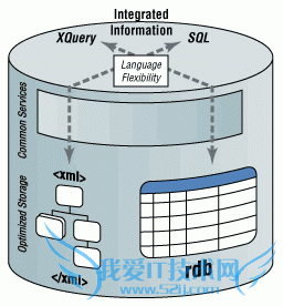 在两种数据存储(关系和 XML)的顶部的数据库引擎可以处理 XQuery、Xpath、SQL 和 SQL/XML。该引擎采用带有 SQL 和 XQuery 解析程序的双语查询编译器。因此开发人员可以根据具体情况更适用的原则使用 SQL 或 XQuery 任何一种语言(或同时使用这两种语言),支持事务级的 XML 操作。
