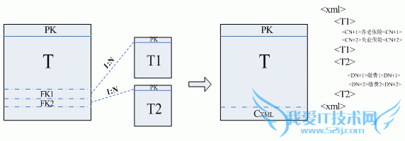 对需要对增加从表来对主表进行扩展的模式,也只需对列末的 XML 类型进行扩展,扩展的从表全部由 XML 来存储。
