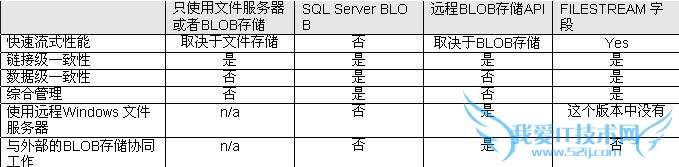 下表比较了SQL Server 2008中的BLOB数据的存储选择。